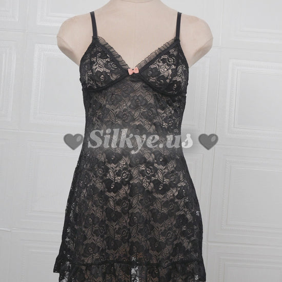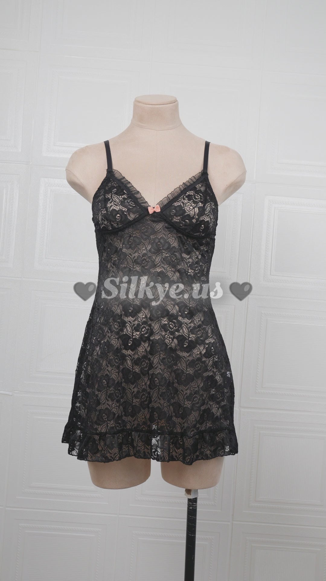 This sheer lace lingerie dress features a delicate floral pattern and ruffled hem for a flirty touch. The built-in bra cups provide gentle support, while a small bow detail at the bust adds a sweet accent. Designed with adjustable straps for a customized fit. The dress opens from the back for easy wear.