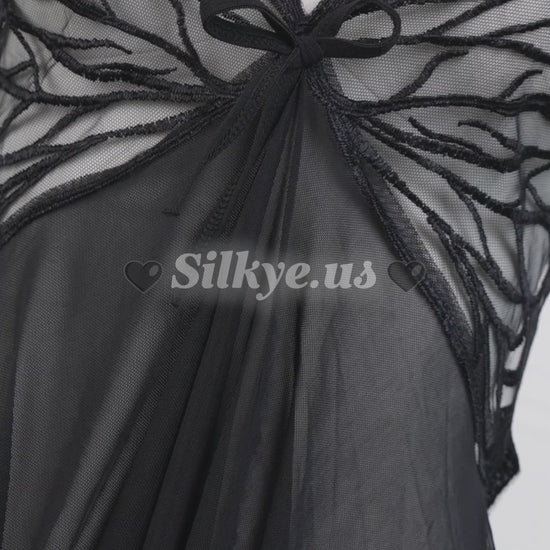 Turn heads with this alluring black lace nightdress featuring a stunning butterfly wing design.