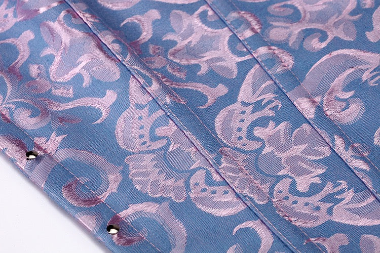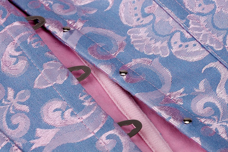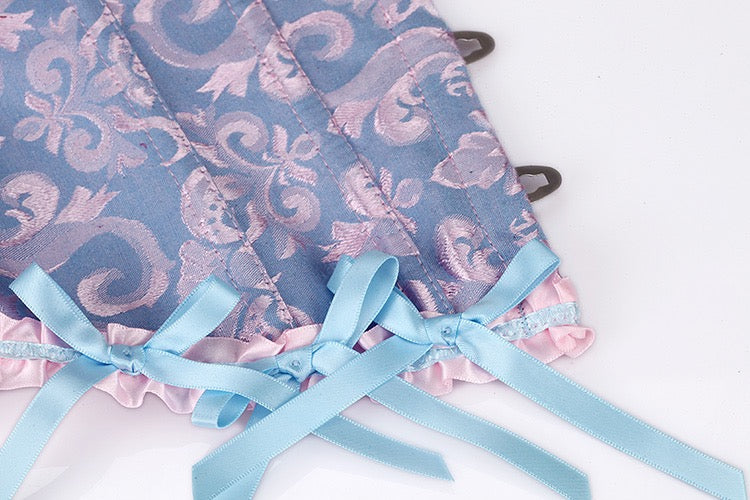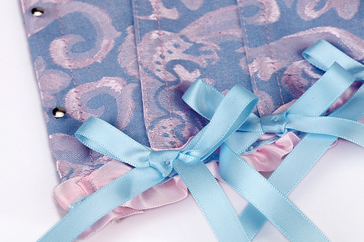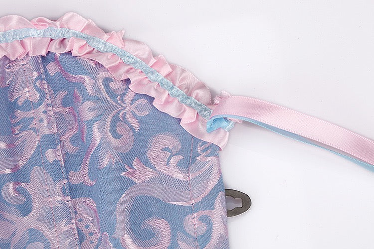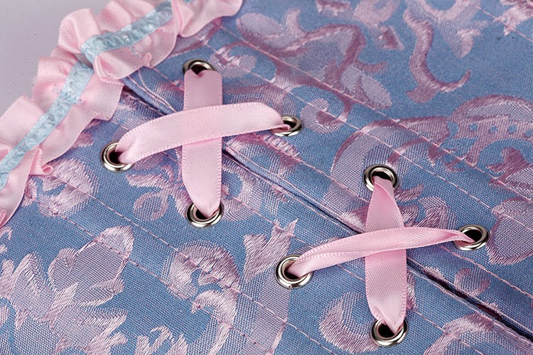 The Celeste Enchanté Corset embodies a dreamlike fusion of grace and allure. Crafted from intricate brocade fabric with soft shimmer detailing, it features delicate pink ruffle trim and satin ribbon accents that enhance its romantic charm. The structured boning defines the waist beautifully, offering a sculpted, elegant silhouette. Finished with cascading blue ribbons, this corset evokes the fantasy of a moonlit ballroom — feminine, confident, and effortlessly enchanting.