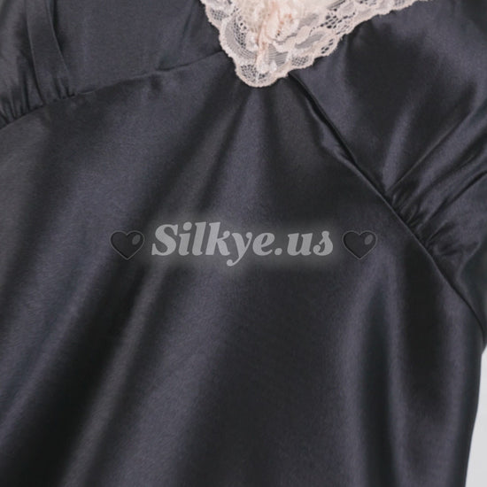 This champagne/black/blue satin slip dress features delicate lace trim for a soft, romantic feel. Its smooth, silky texture hugs the body gracefully. A perfect blend of elegance and sensuality for intimate moments.