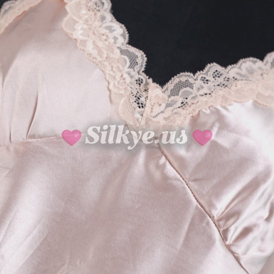 This champagne/black/blue satin slip dress features delicate lace trim for a soft, romantic feel. Its smooth, silky texture hugs the body gracefully. A perfect blend of elegance and sensuality for intimate moments.