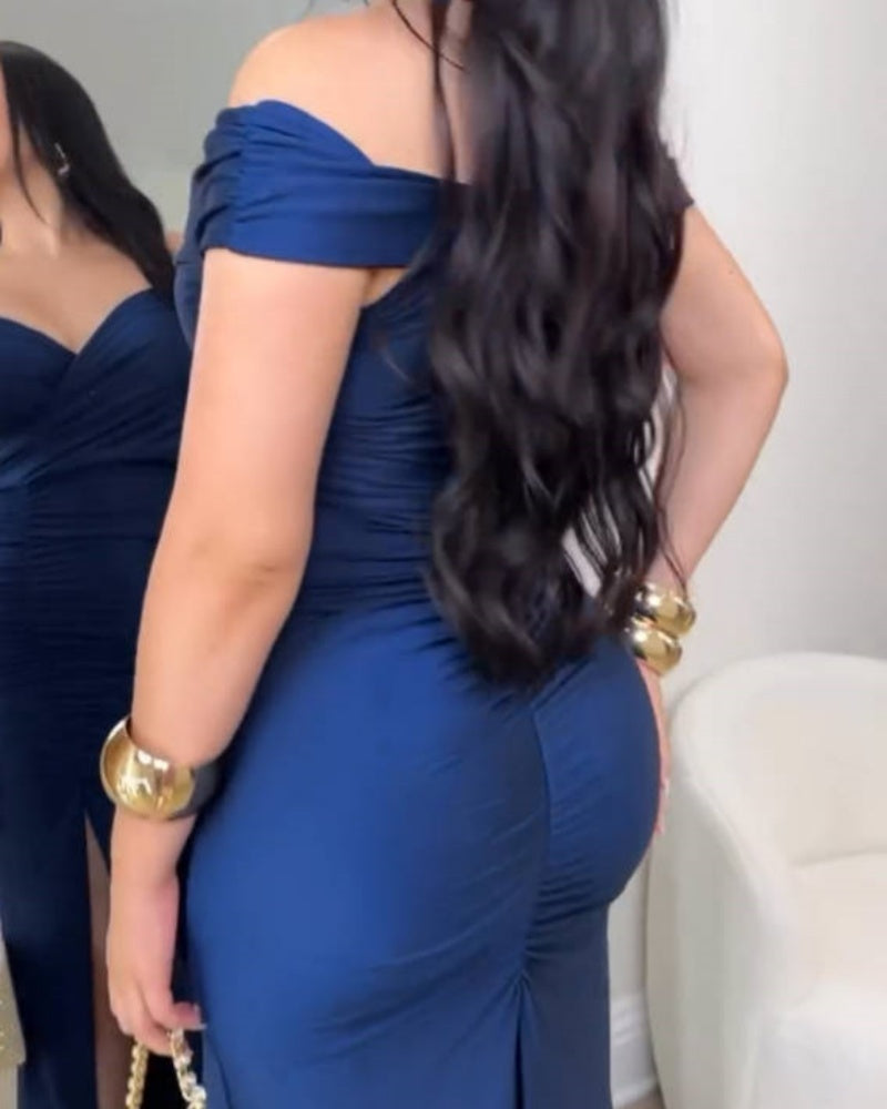 Elegant Off Shoulder V Neck Ruched Maxi Dress Prom Gowns with Side Slit