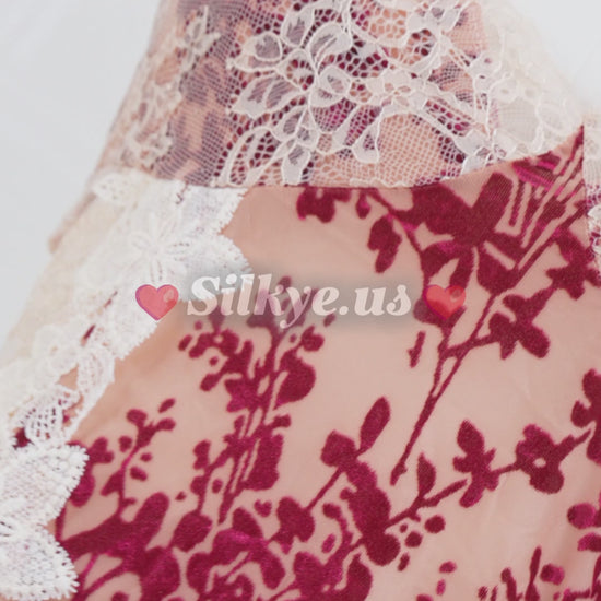 This vintage-inspired slip dress features sheer lace panels and luxurious velvet floral embroidery.