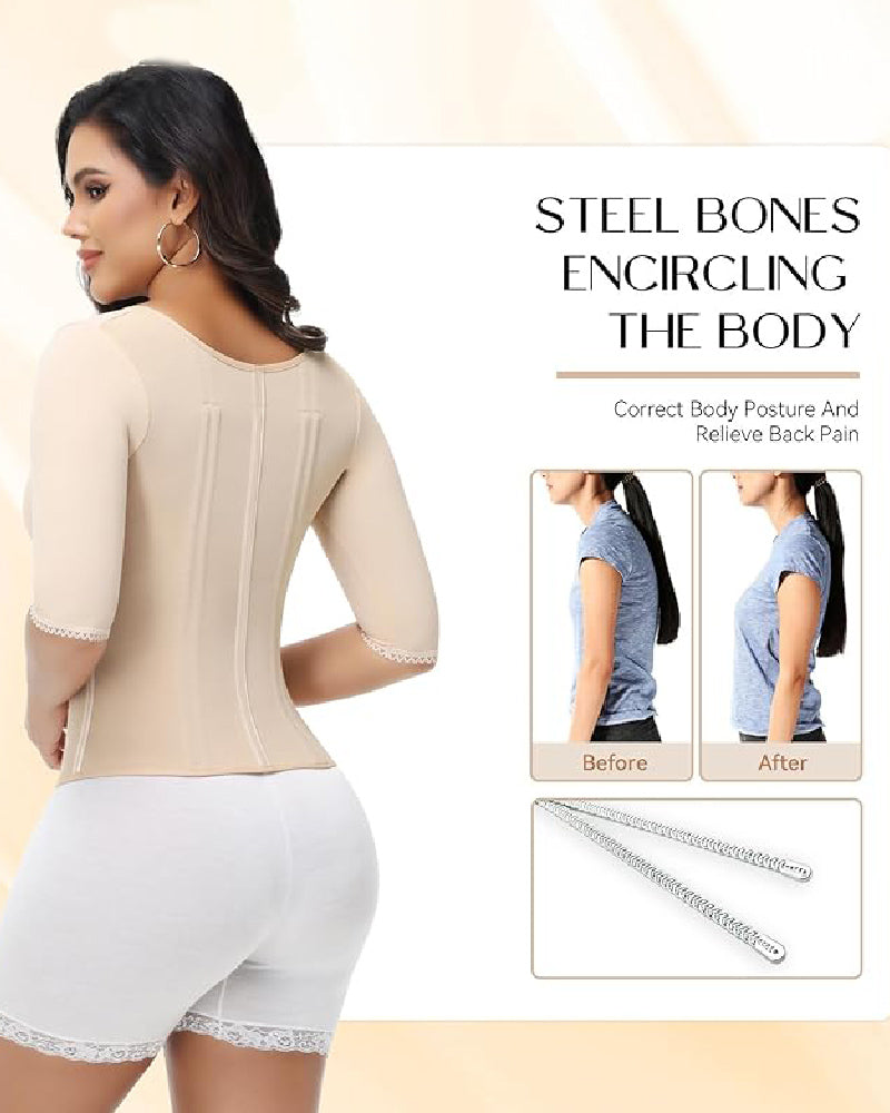 This Waistband With Snaps, Our waist training corset design with high stretchable long sleeve, best for arm liposuction recovery to tighten loose skin, smooths and tights bumps and bulges, reduce arm and back flab, hide your back rolls, give your a slimmer figure.