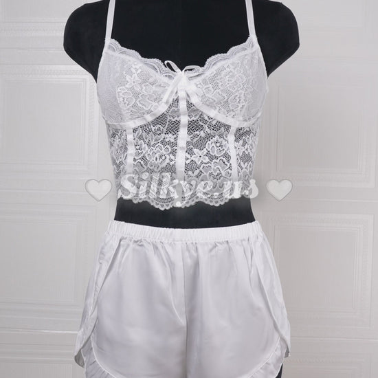 This delicate white lace lingerie set features a charming bralette with a bow detail and soft, adjustable straps. Paired with satin shorts, it offers a luxurious, comfortable fit. The ruffled hem of the shorts adds a playful touch to this feminine design. Perfect for lounging in style or a special night in.