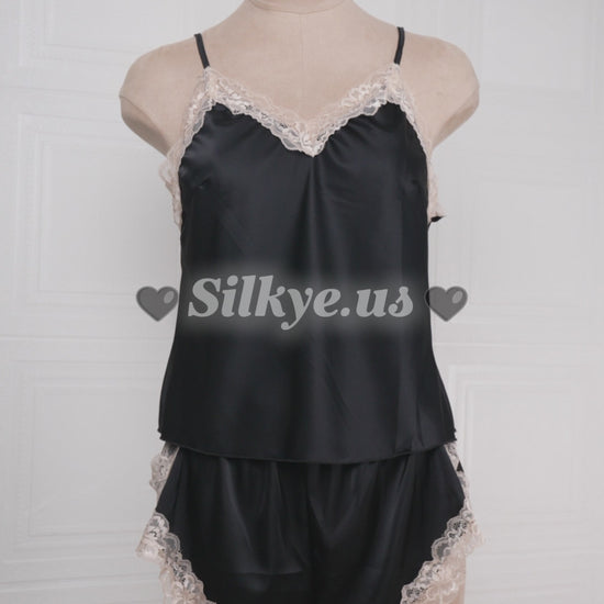 This delicate satin set, featuring a lace-trimmed top and matching shorts, offers both comfort and elegance. The soft fabric drapes beautifully, making it the perfect choice for relaxing evenings. The subtle lace detailing adds a touch of femininity and grace. A luxurious addition to any loungewear collection.