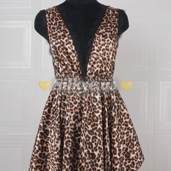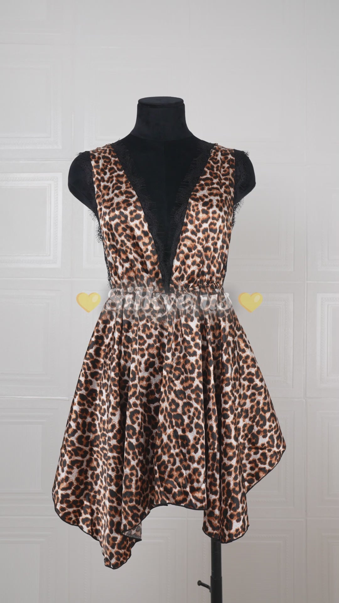 Unleash your wild side with this sultry leopard print satin slip. Featuring a daring deep V-neckline trimmed with delicate black lace, it's made to captivate. The soft, flowy silhouette hugs in all the right places for effortless allure. Perfect for nights when you're feeling bold and untamed.