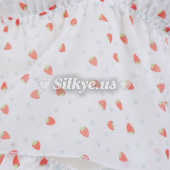 This playful pajama set includes a spaghetti-strap camisole with lightly padded cups and a relaxed, flowy fit. The matching shorts feature a ruffled hem and a comfortable elastic waistband. Covered in a cute fruit pattern, the soft, breathable fabric makes it perfect for lounging or sleepwear. The design blends sweet and flirty in a charming, casual style.