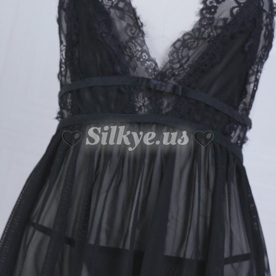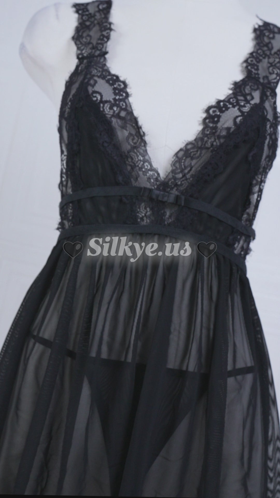 Sheer Mesh Deep V Lace Cami Nightgown Black