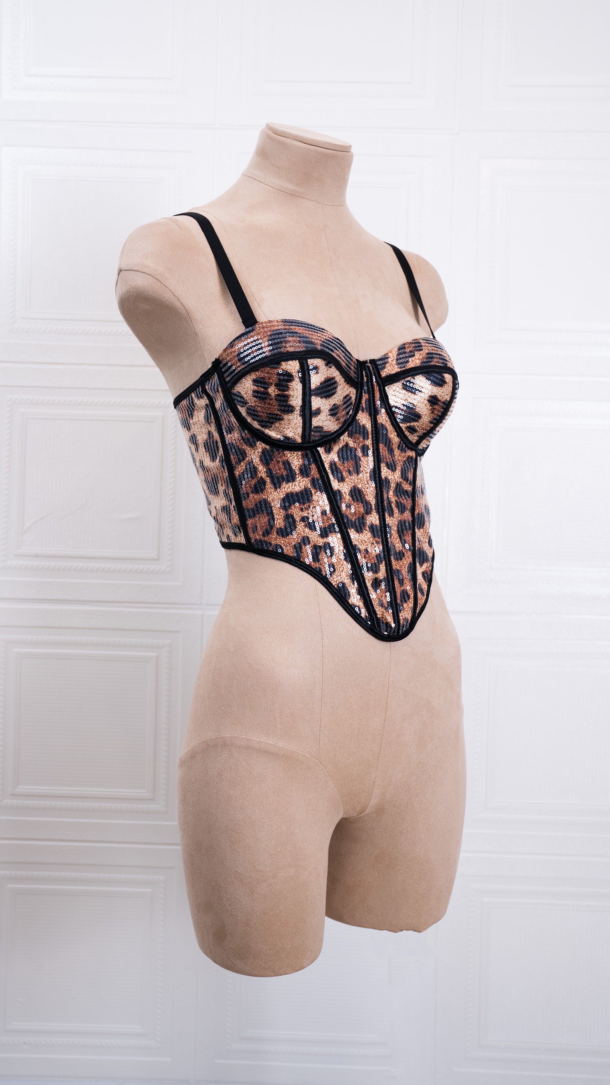 Designed to make a bold statement, this corset combines sculptural structure with striking texture. Featuring a contoured bust, reinforced boning, and a dramatic pointed hem, it creates a powerful waist-defining silhouette. The shimmering surface adds depth and dimension, while adjustable straps ensure a secure and flattering fit. A confident, fashion-forward piece that elevates any look with attitude and allure.